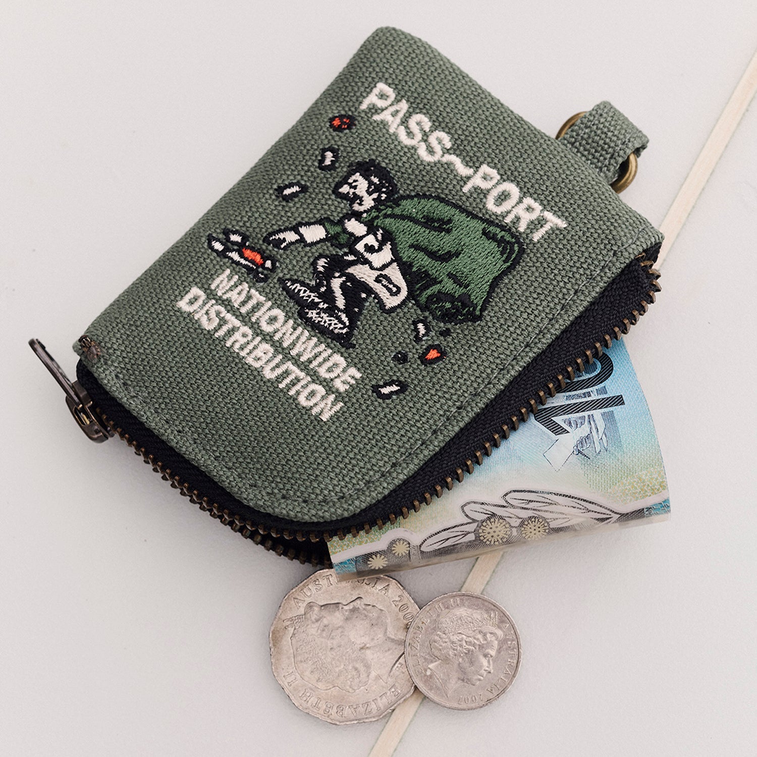 Pass~Port Distribution Coin Pouch is part of the kitsch selection for range #46. Made from heavy canvas featuring embroidery design on front and back, YKK zip and attachable D-ring.
