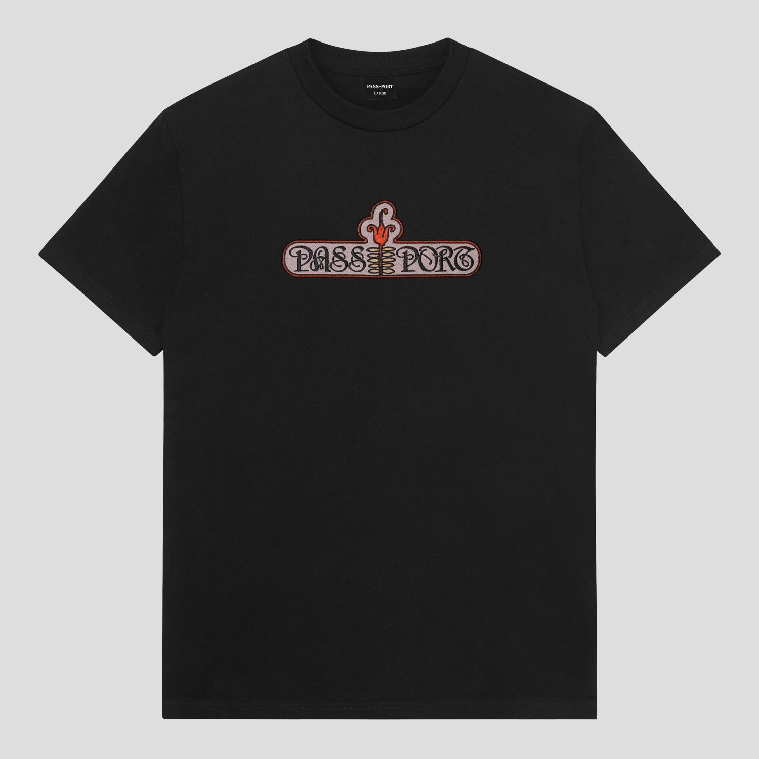 Introducing Range #44: The Pass-Port Gardenia Tee in black is made from 100% cotton and features a directly embroidered graphic on the front. It offers the signature Pass-Port fit.