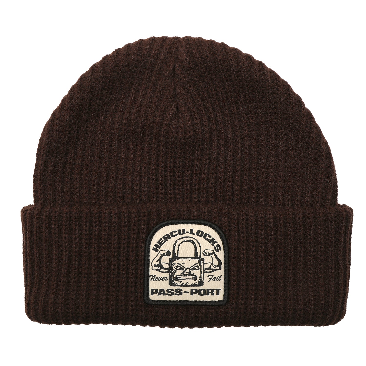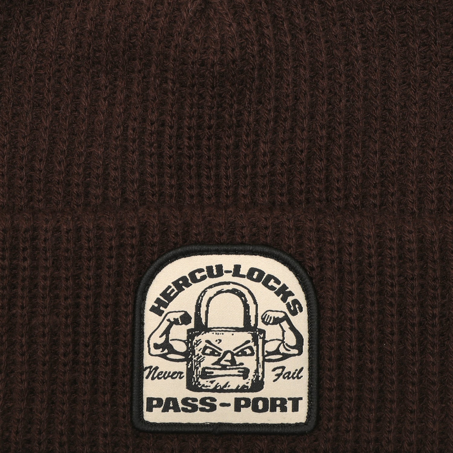 Pass~Port Hercu-Locks Beanie in Dark Choc from range #46. The Pass~Port beanie is made from 100% acrylic waffle knit and features a woven patch on the front.