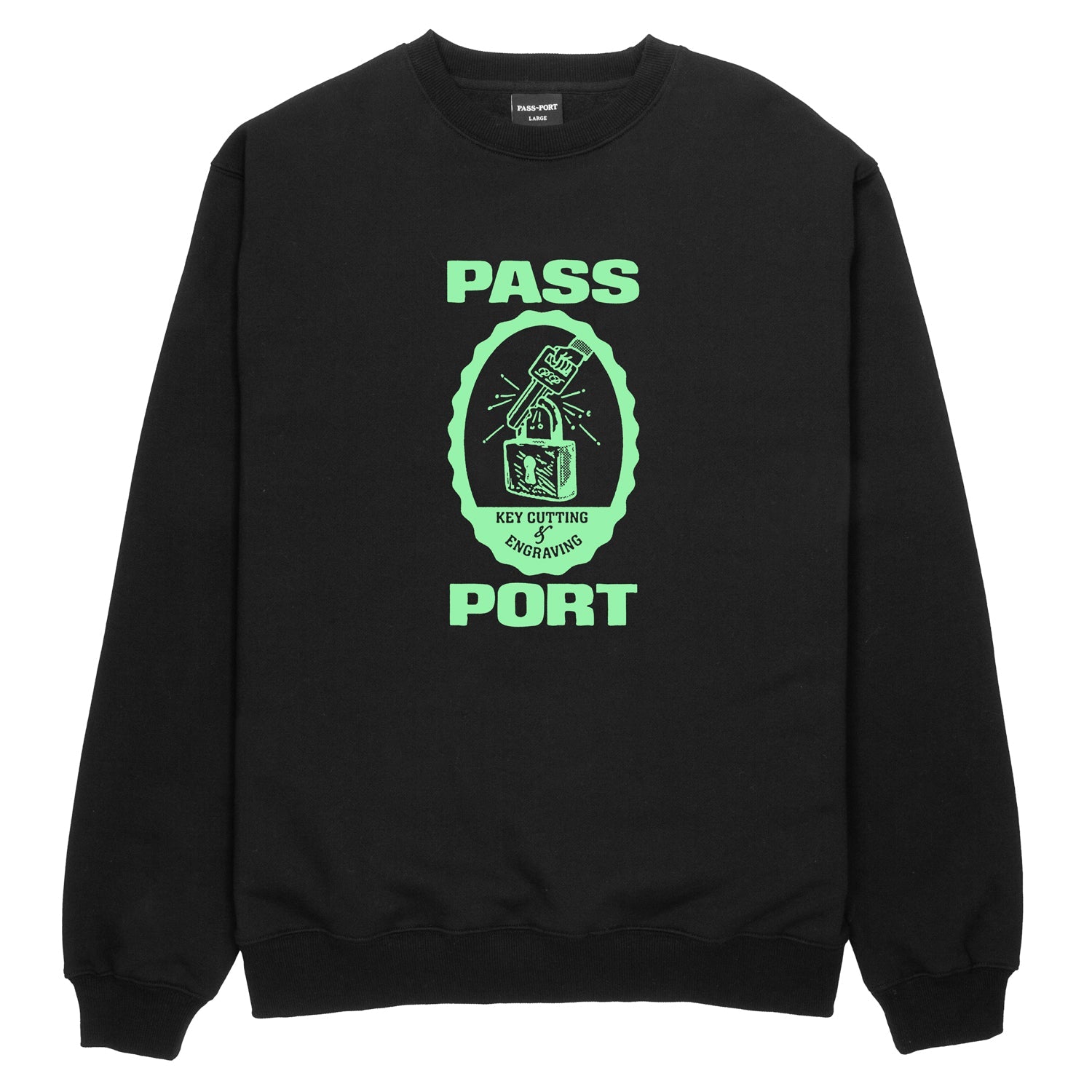 Pass~Port Hercu-Locks sweater in Black is part of the fleece collection for range #46. This crewneck is made from a cotton polyester blend and features screen print graphic on front and back, finishing in the classic Pass~Port sweater fit.