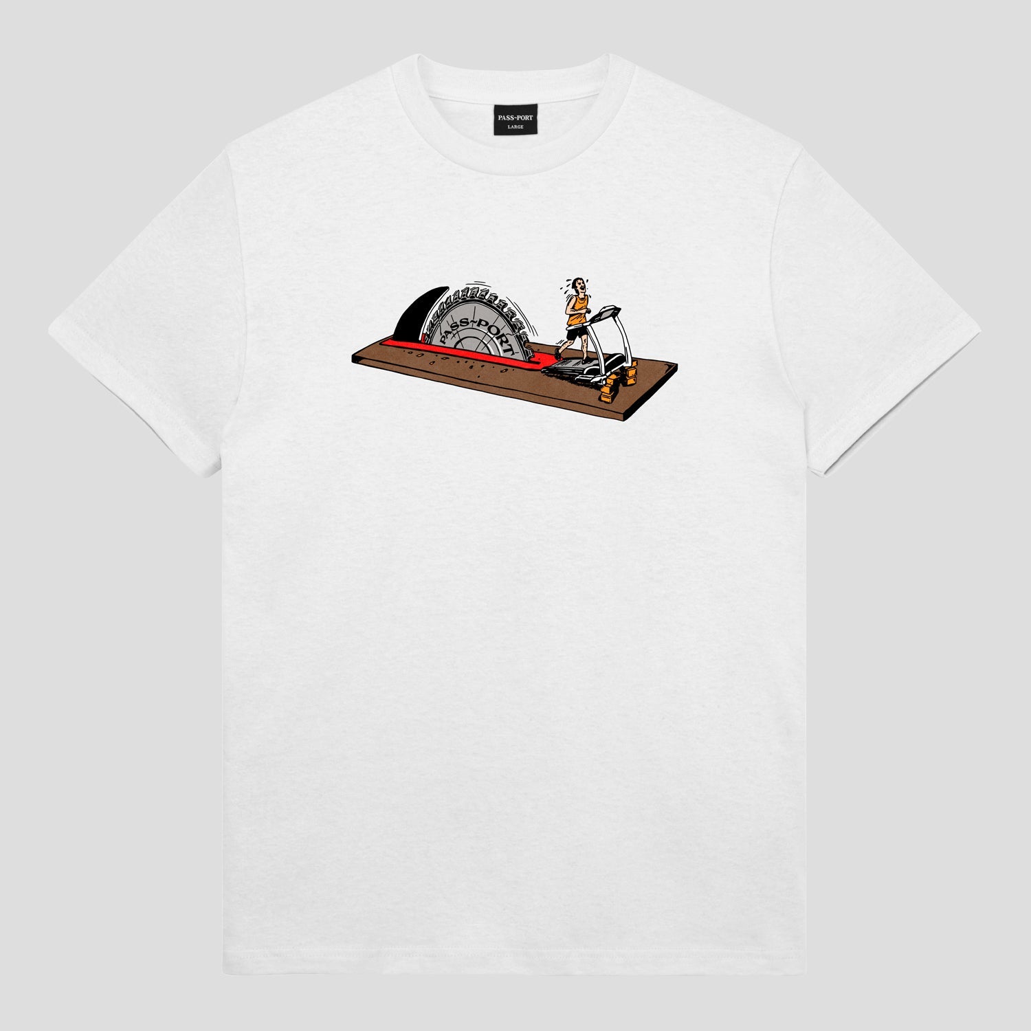 Introducing Range #44: The Pass-Port Keep Running tee in white is made from 100% cotton and features a screen printed graphic on front. It offers the signature Pass-Port fit.