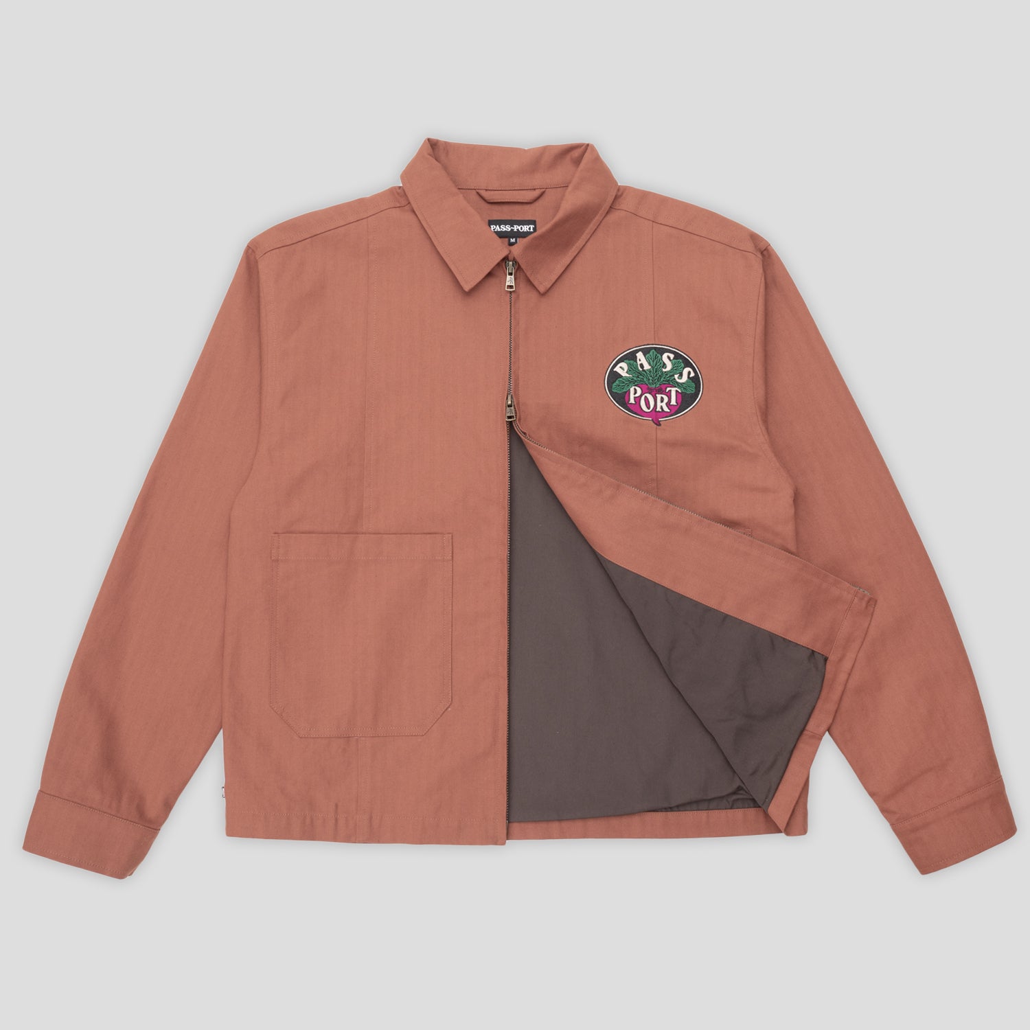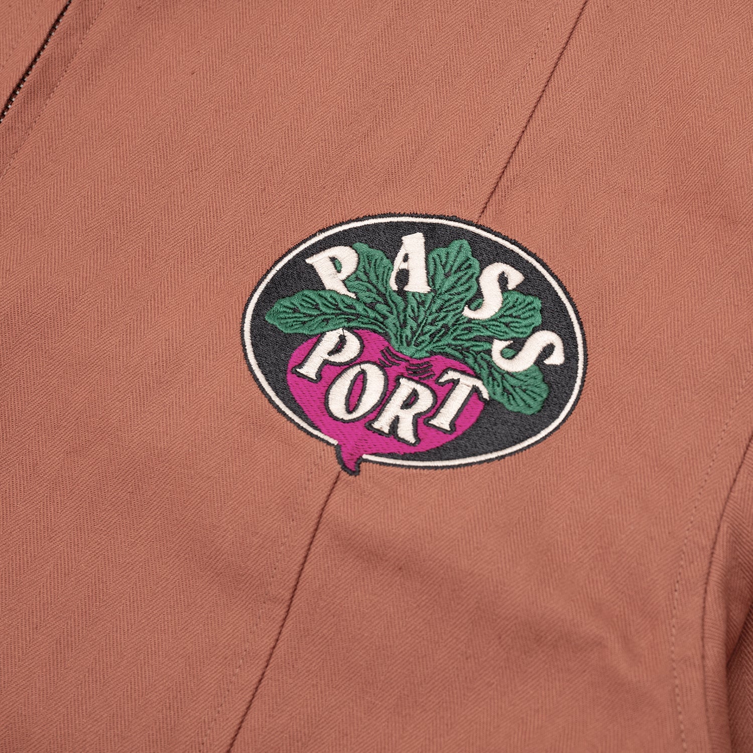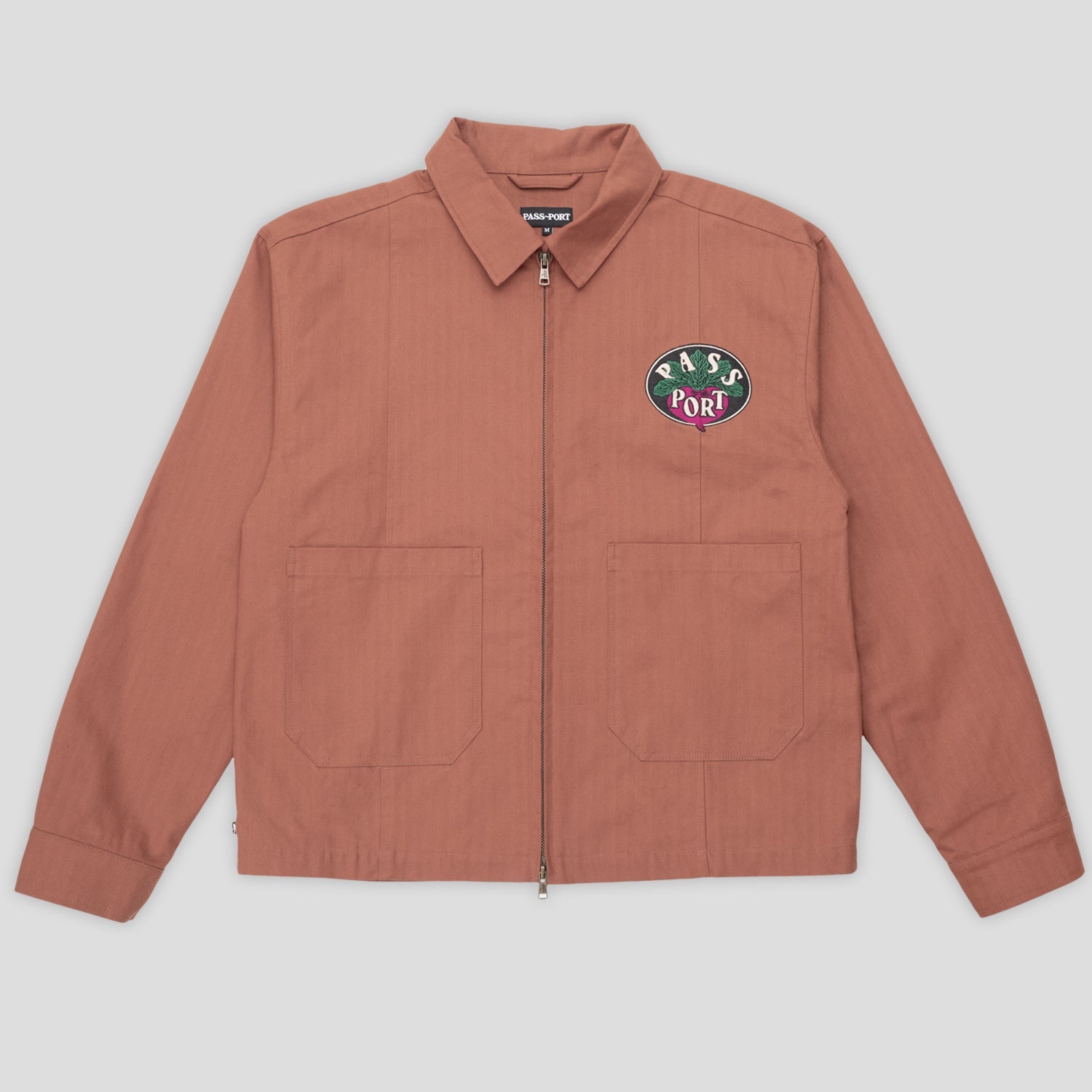 Pass~Port Radish Herringbone Workers Jacket from range #44. The Pass~Port workers jacket is made from 100% cotton herringbone shell and is lined with cotton poplin for warmth. The jacket also features a double zip and direct embroidery graphic.